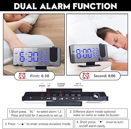Vitor sveglia con proiettore, sveglia digitale da comodino a led con funzione radio fm, porta di ricarica usb, 4 livelli di luminosità 2 sveglie, snooze, camera da letto, 12/24 ore,termometro interno: